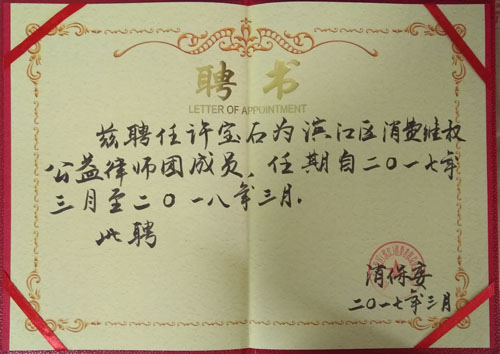许宝石:杭州专职律师,南京大学民法本科,东南大学法学硕士。 本着受人之托,忠人之事的理念。 处理过包括合同纠纷、婚姻家庭、交通事故、债权债务以及刑事等各类案件。具有丰富的案件处理经验以及扎实的法律理论功底。从业数年来办理各类诉讼和非讼案件数百起,每次都力求站在委托人的立场,从他们的利益、情感出发,为他们调解、辩护,赢得了委托人一致好评。 2017年为杭州市滨江区消费维权公益律师团成员; 2019年成为浙江省法律援助中心死刑案件辩护律师团队(第一批次)成员; 2019年3月成为杭州市刑法专业委员会委员; 2019年6月成为杭州市中级人民法院调解员。 在专业期刊发表了《浅析资本认缴制下股东出资责任制度研究》、《浅论保险人的说明义务》、《浅论劳动合同法项下的服务期》、《公司非破产清算人相关法律问题研究》等多篇论文。 多年以来一直积极参与公益活动